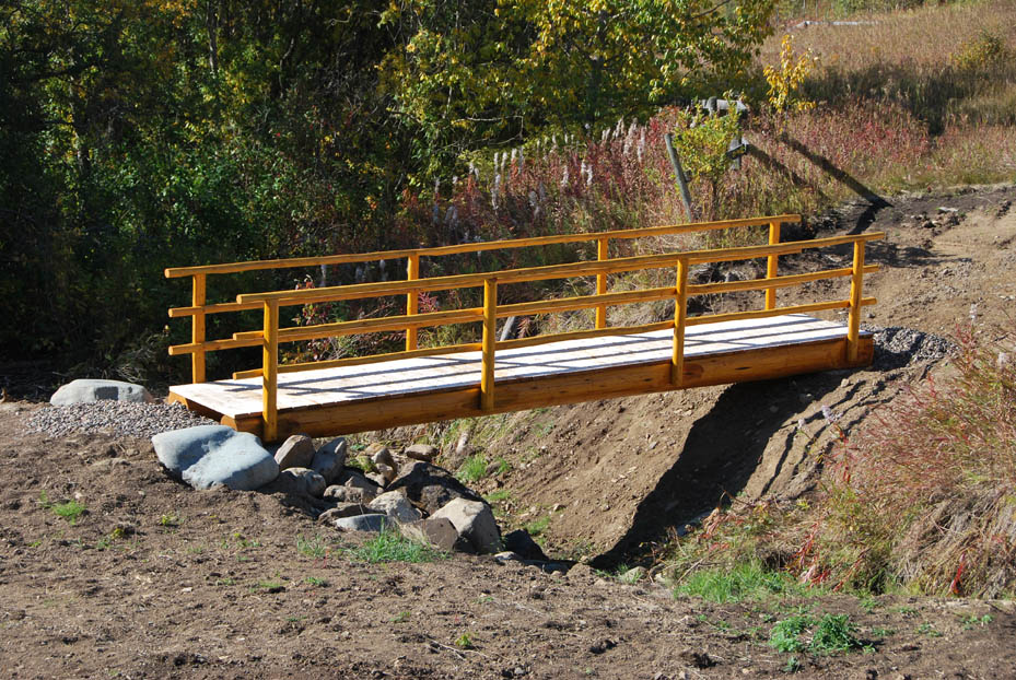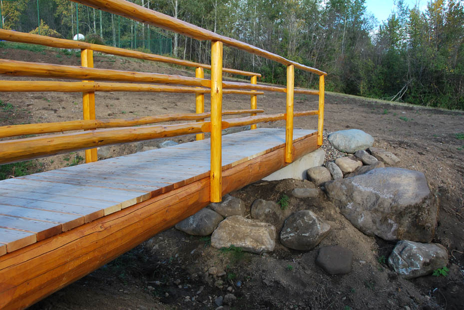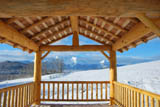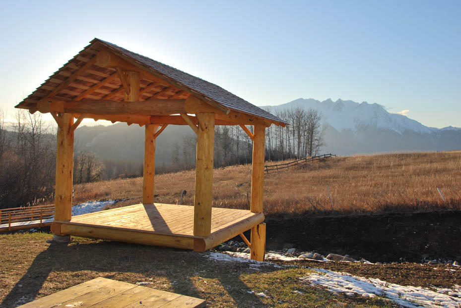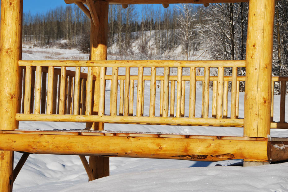 In addition to building log shells, we are also able to build specialty structures such as log bridges and small log outbuildings. The photos show a log bridge crossing our seasonal creek. The log stringers are 25' long and the log railing is made of dry pine. The rails and posts are secured using counter-sunk lag bolts. All bolt ends are covered with wooden plugs. The outbuilding shown is a log gazebo with a spectacular view of Hudson Bay mountain. Log rafters, rails and spindles are made using dry pine logs. The spindles are secured to the rails using wooden dowels. Contact us for information and pricing on log bridges and outbuildings. |