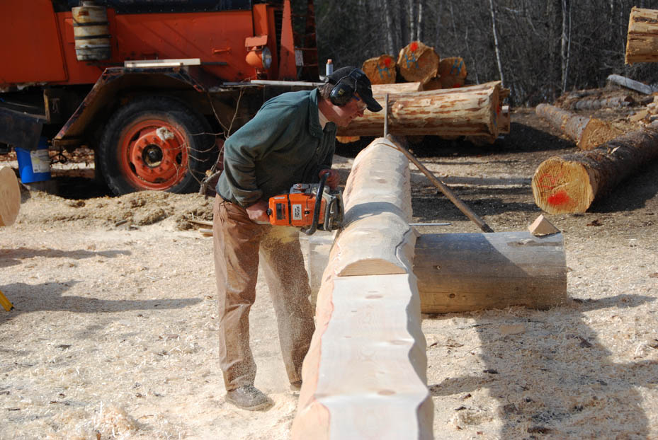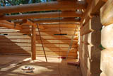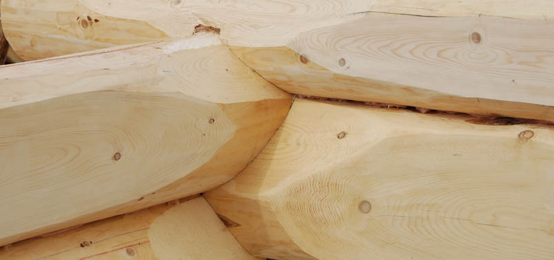 In a D-profile log shell the inside face of the log is flattened and the outside face is left round. Usually, the corners in this type of shell are made using a dovetail notch and the inside face of the log is flattened before it is fitted. Our D-Profile log shells are unique in that the corners are made using the standard saddle notch thereby preserving the usual outer appearance of interlocking logs with the log ends extending several feet beyond the corner. From the inside, the appeal of the traditional saddle notch is maintained with a short transition to the full D-profile of the log wall as the accompanying photos show. The D-profile is cut on each log after the log is fitted. This makes the process more labour intensive but by retaining the saddle notch, the interior of the log shell gains a most interesting and unique appearance. Contact us for more information on our D-Profile log shells, including cost estimates. |